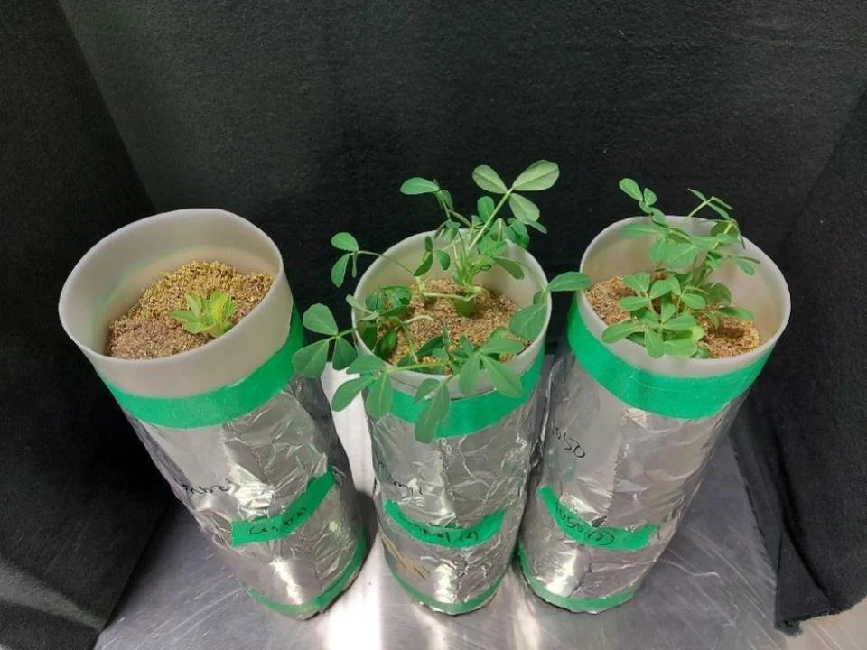 Initial screening of symbiotic bacteria for their ability to fix N in Leonard’s jar system. The left jar contains plants that were grown in no N growth medium, and seeds were not inoculated with the symbiotic bacteria (negative control). The middle plants were grown in a medium supplemented with N, and seeds were not inoculated. The right jar contains plants that were grown in no N medium, and seeds were inoculated with a novel symbiotic rhizobium.